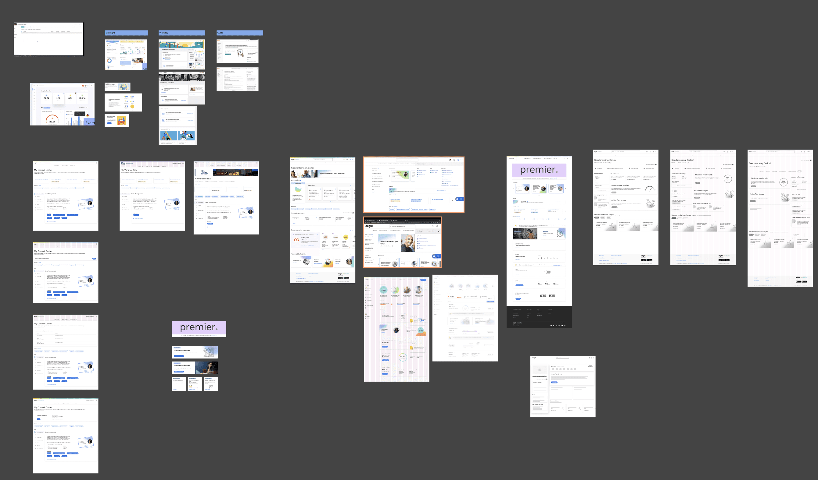 A reference board of content types, legacy screens, and brand elements used to align design with business goals and user expectations.