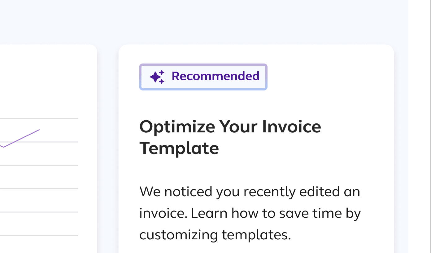 Inline help and tips appear only when needed—linked to the user’s active tool or data view. Inspired by the principle of progressive disclosure. We also surfaced intelligent suggestions like optimizing invoice templates based on recent activity.