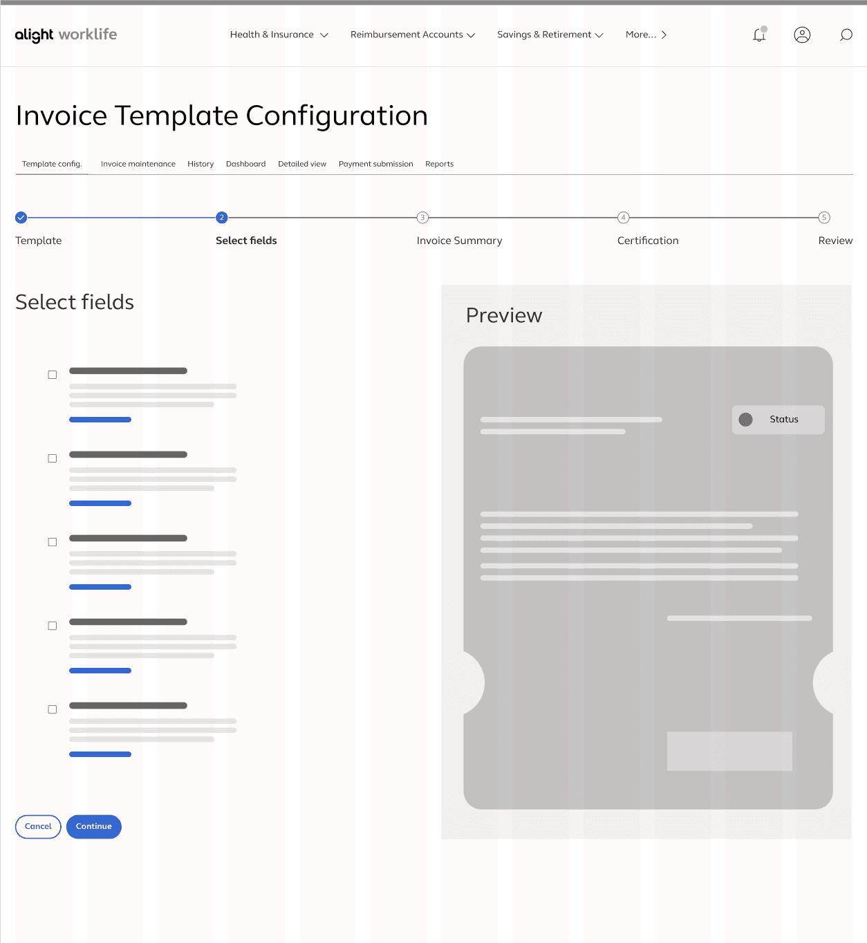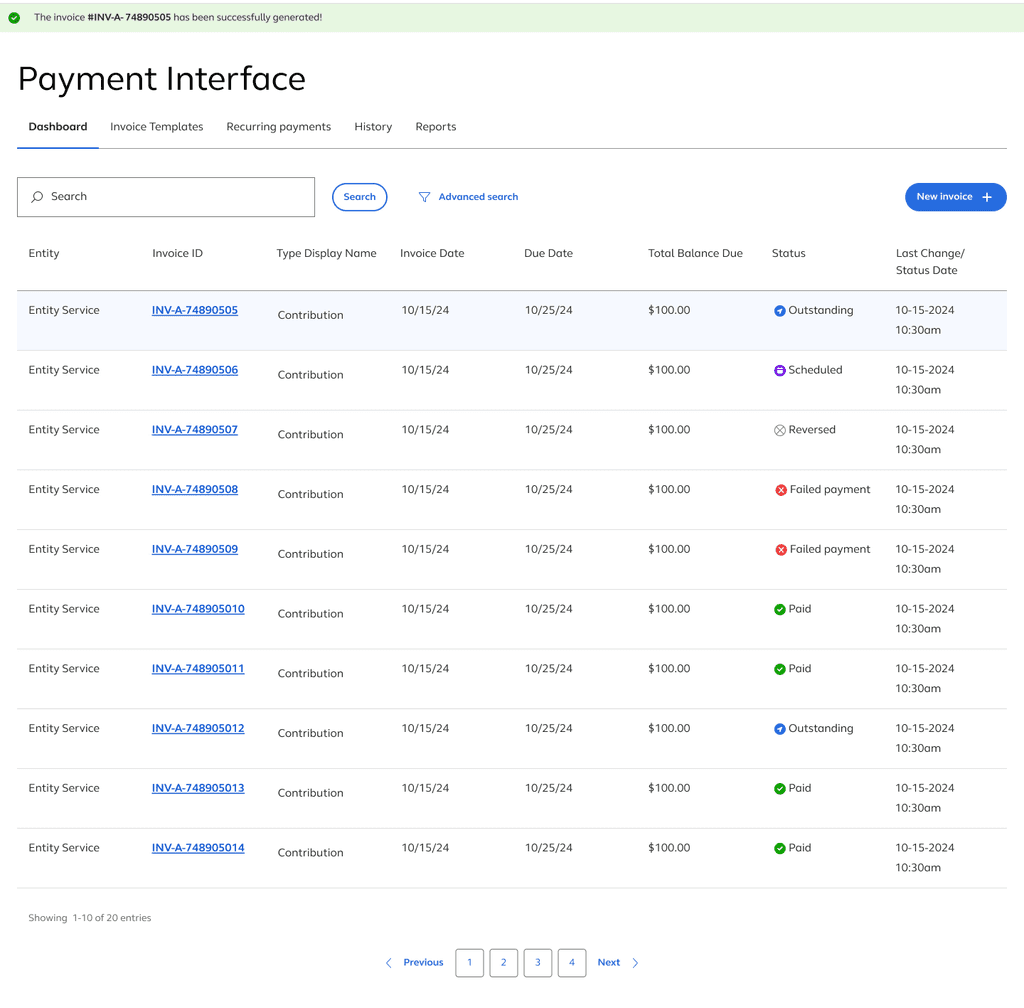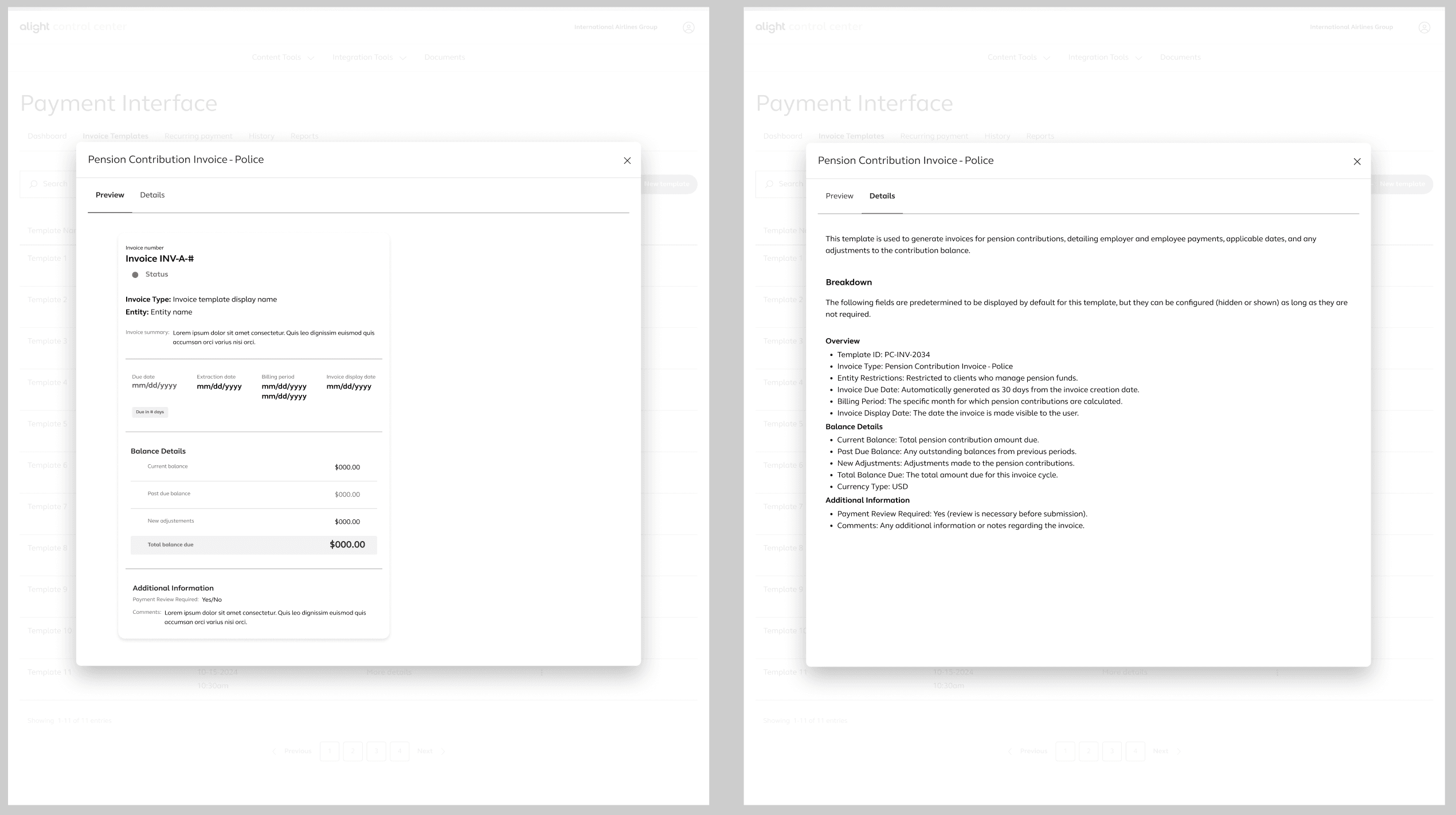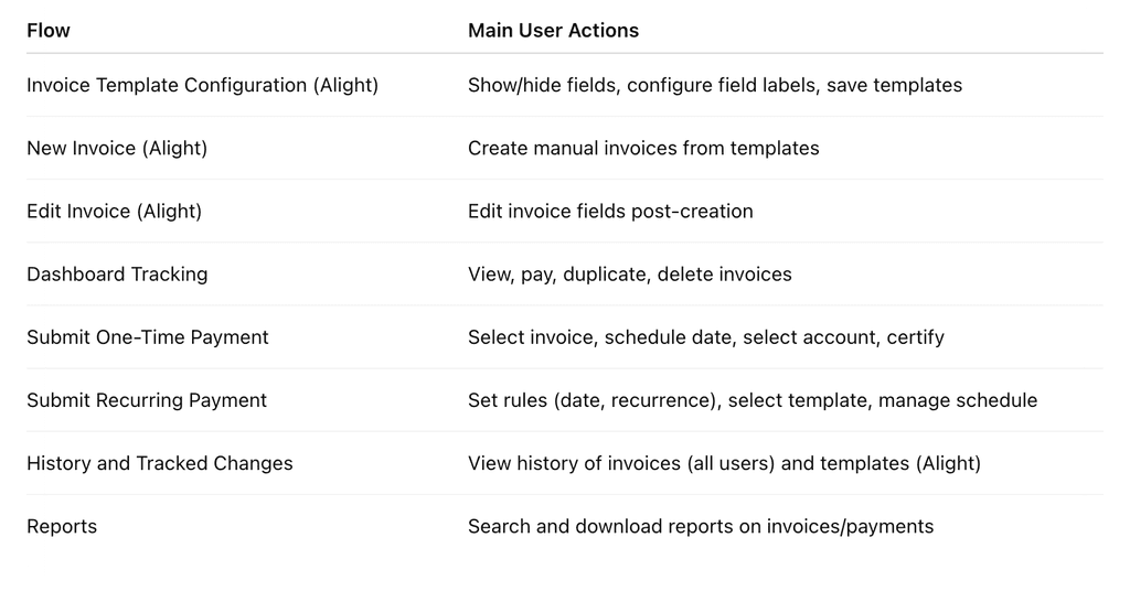 Payment Interface is a new tool designed to streamline invoice management, payment submissions, and tracking for both Alight employees and external clients. It needed to support flexible invoice templates, multiple payment types, recurring payment scheduling, and a full audit history — all while operating within strict technical and design system constraints.